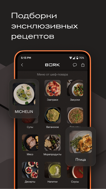 Utöver produktkatalogen inkluderar BORK mer än 100 recept, noggrant utvalda och utvecklade av BORK:s kock. Recepten är indelade i olika kategorier såsom världsdelar, högtider, dieter och barnmeny, vilket gör det lätt att hitta något som passar alla. Användare kan spara sina favoritrecept och skapa inköpslistor med saknade ingredienser, vilket gör matlagning både roligare och mer organiserad.
